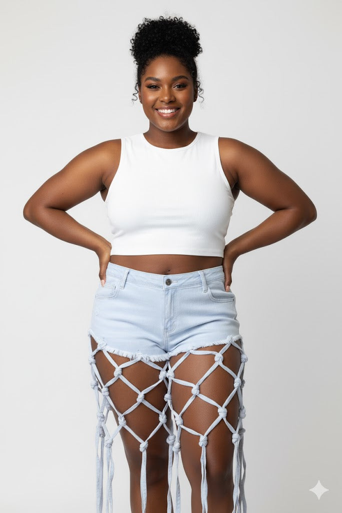 White Denim Shorts w/ Knotted Tassels Available in Size L (Lots of Stretch)
